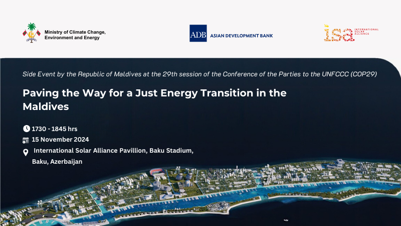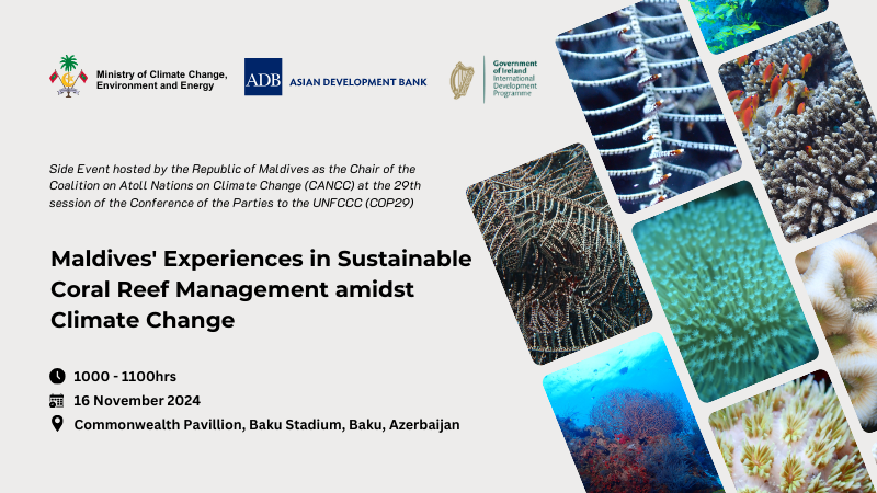 The Maldives will host three side events at the 29th session of the Conference of the Parties to the United Nations Framework Convention on Climate Change (COP29) in Baku, Azerbaijan. These events, organized in collaboration with international partners, will showcase the Maldives’ efforts in renewable energy transition, coral reef conservation, and climate transparency
