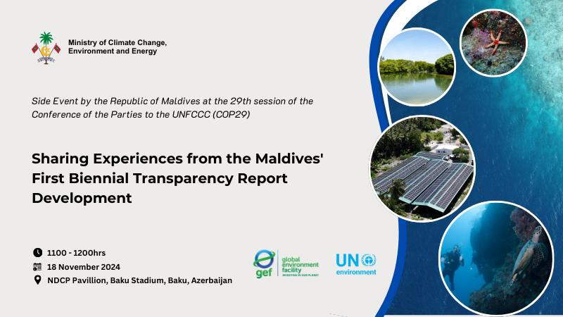 This side event will provide an overview of the Maldives’ journey in developing its first Biennial Transparency Report (BTR) by the 31st December 2024 deadline. Key lessons learned, challenges faced, and strategies for strengthening climate reporting and accountability under the Paris Agreement will be highlighted. As a vulnerable island nation on the frontlines of climate change, intends to utilize the BTR as a vital tool for tracking and reporting national progress in implementing its Nationally Determined Contribution as well as incorporating these institutional arrangements for integrated national planning and development. The event will delve into the coordination processes across various sectors, the methodologies applied, and the lessons learned during the development of the BTR. These insights aim to provide valuable guidance for other Small Island Developing States (SIDS) and nations facing similar challenges.