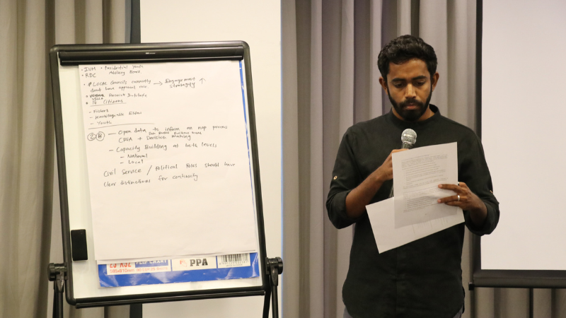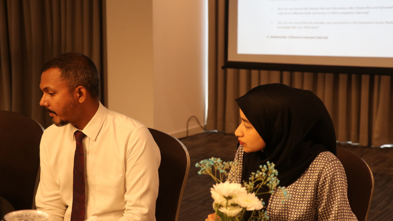 The workshop included presentations on the Maldives NAP project overview, the draft NAP Roadmap, the Stakeholder Engagement Strategy, and the draft model for integrated institutional mechanisms. These were delivered by Ms. Zainab Gulisthan, NAP Project Coordinator; Mr. Moosa Zameer, Consultant; and Ms. Jauza Khaleel, Senior Climate Change Adaptation Consultant. Participants then engaged in breakout sessions and a World Café-style discussion to review and provide feedback on the roadmap objectives, stakeholder mapping, and guiding principles for adaptation planning.