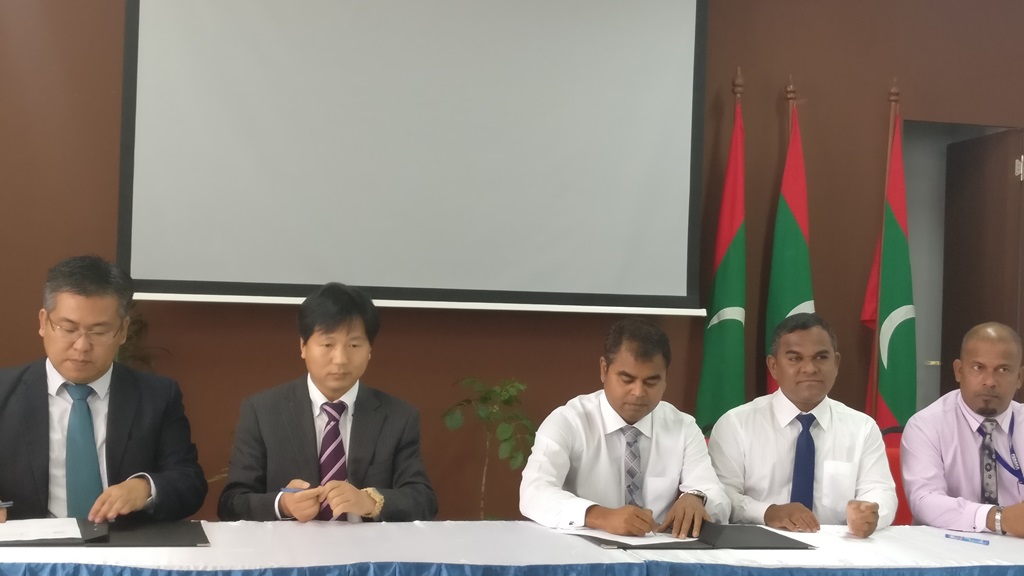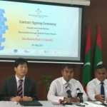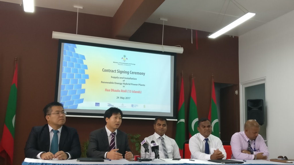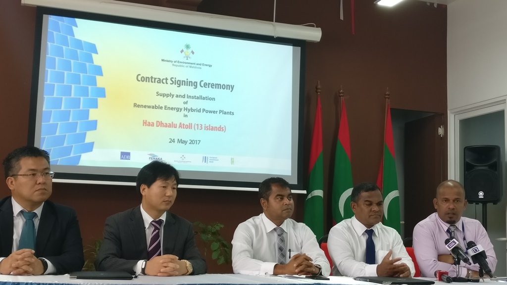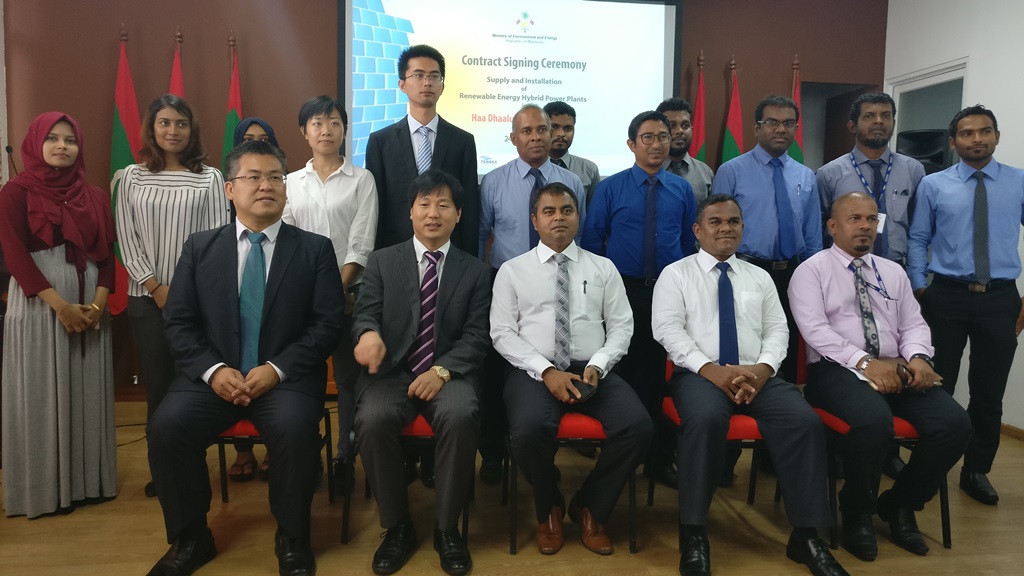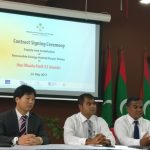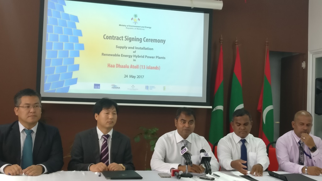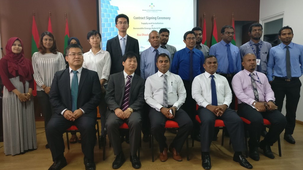 Contract signed for the Supply and Installation of Renewable Energy Hybrid Power Plants in 13 islands of Haa Dhaalu atoll. The contract was awarded to Changzhou Trina Solar Energy Cooperation Limited of China. Minister of Environment and Energy, Mr. Thoriq Ibrahim signed the contract while the General Manager of Changzhou Trina Solar Energy Cooperation Limited, Mr. Frank signed the contract on behalf of the company.