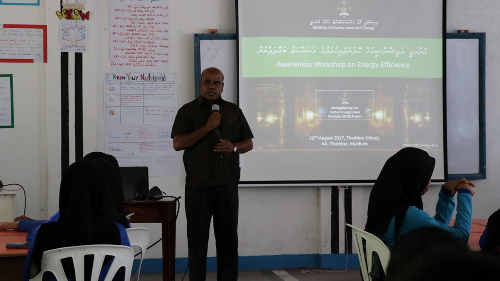 Strengthening Low Carbon Energy Island Strategies (LCEI) project conducted Energy Efficiency Awareness Workshops in AA. Thoddoo on 22nd August 2017.. A total of 38 students from Grade 8 and 9 of Thooddoo School participated in the workshop.