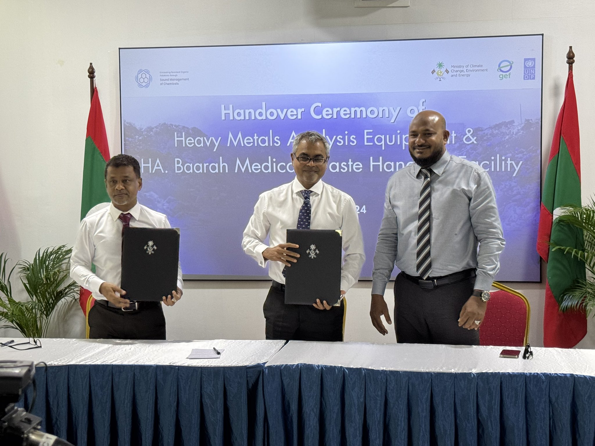 The Ministry and the Ministry of Health (MoH) has signed a Memorandum of Understanding to strengthen healthcare waste management infrastructure and address pollution from healthcare activities. As part of this collaboration, MCCEE transferred the Baarah Medical Waste Handling Facility to the MoH and Inductively Coupled Plasma Mass Spectrometry (ICP-MS) equipment to the National Health Laboratory. This partnership promotes sustainable and safe medical waste management, supporting the Maldives' commitments under the Stockholm and Rotterdam Conventions and aligning with local environmental and health regulations.