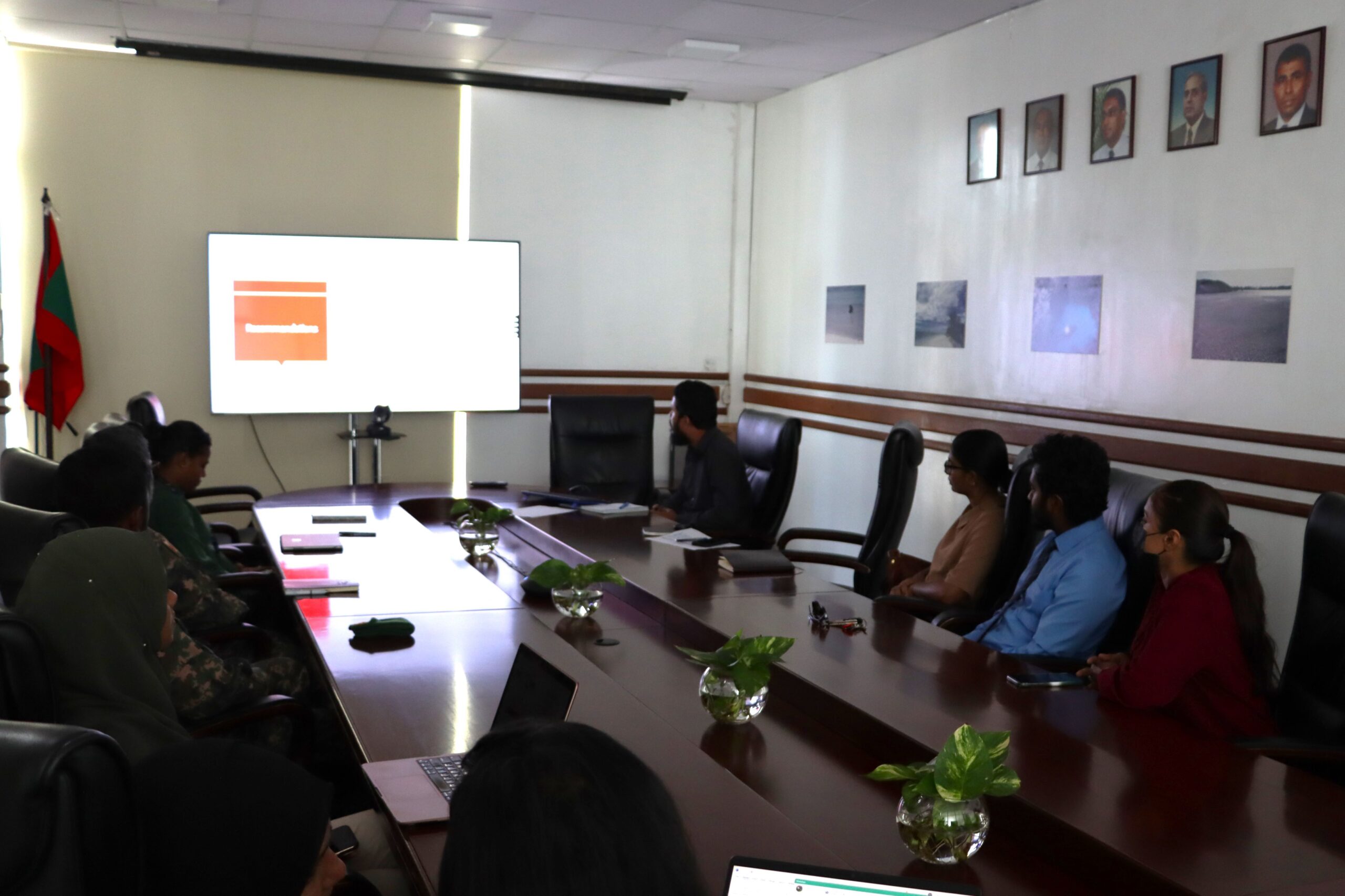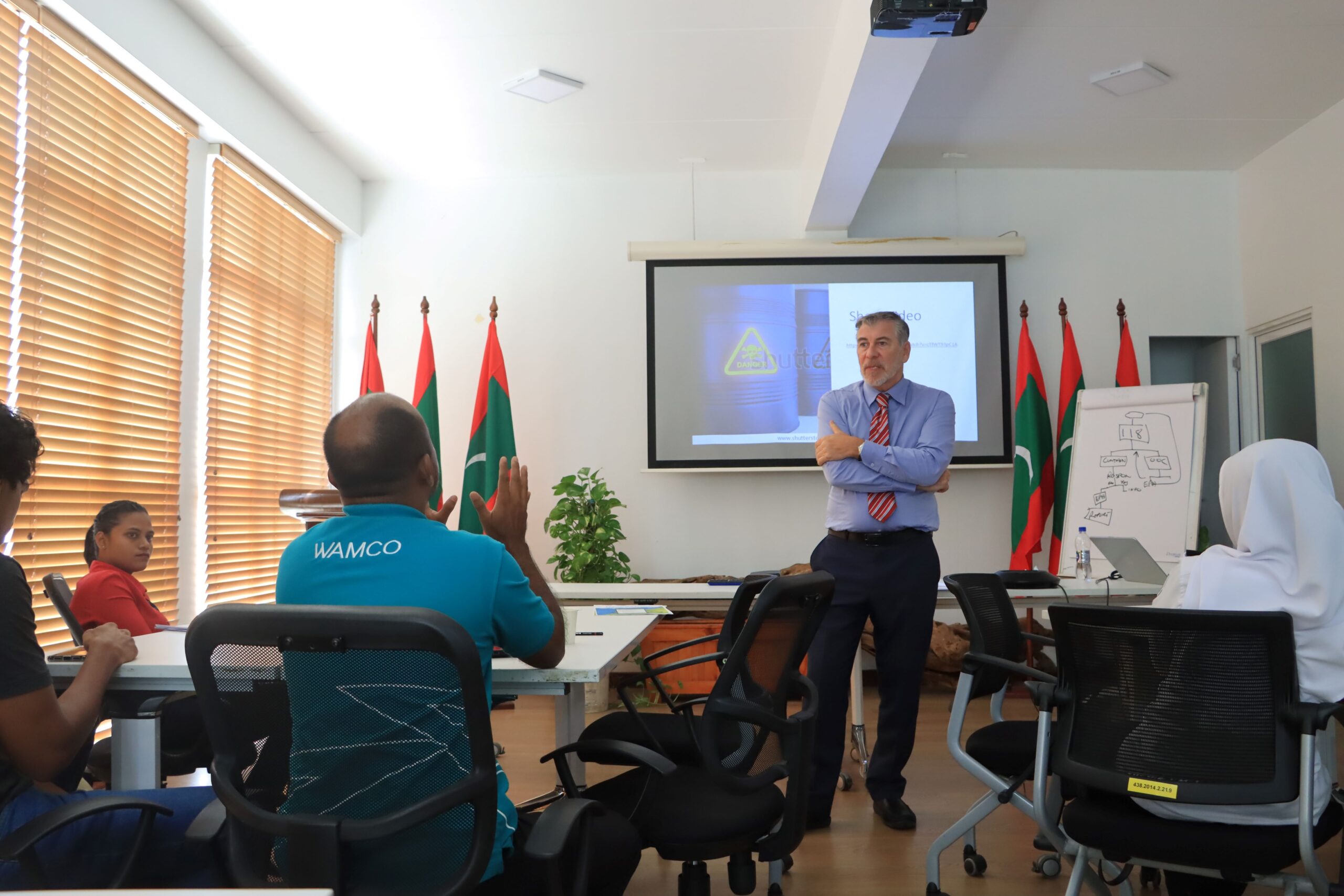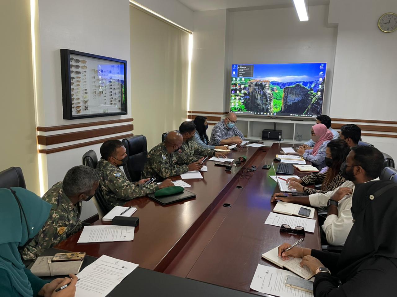 The meeting brought together representatives from the Ministry of Tourism and Environment, the United Nations Development Programme (UNDP) in the Maldives, and Waste Management Corporation Limited (WAMCO). Discussions focused on staffing, training needs, and practical actions required to commence operations at the Addu Interim Hazardous Waste and Chemicals Storage Facility.
