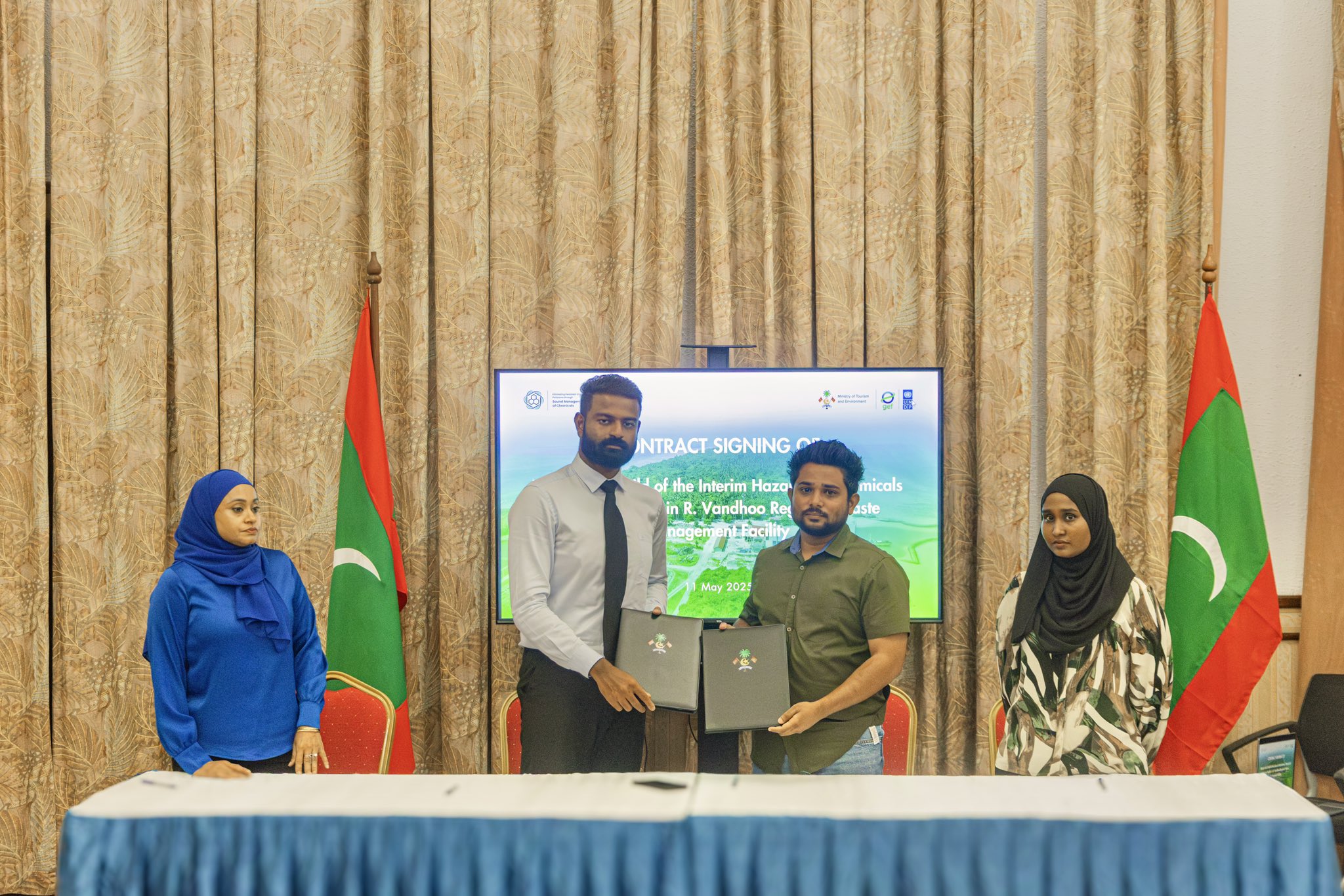 The Ministry of Tourism and Environment signed a contract with Wee Hour Investment Pvt. Ltd. to establish an interim hazardous waste and chemicals storage facility at the Vandhoo Waste Management Centre in Raa Atoll. Valued at MVR 18.5 million, the project is set for completion by March 2026. This facility will strengthen the sound management of hazardous waste in the Maldives by providing secure storage for hazardous waste streams such as Lithium-ion batteries, fire extinguishers, toxic wastes, and pressure vessels before their export for final disposal. The facility will feature an office, dedicated sorting and storage for hazardous waste.