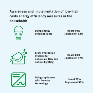A study was conducted in 2017 by the Ministry to understand the extent of public awareness on energy efficiency, opinions on consumer choices, and behavior in energy consumption in selected households. A total of 1894 households participated in this study, representing a mix of housing types and geographical regions. The Questionnaire used in the study was designed to elicit quantifiable information on key research areas of the survey, specifically, Energy efficiency knowledge, Usage patterns, Energy efficiency measures taken in the household, Factors influencing purchase, Barriers to implementing energy efficiency measures, and Readiness to implement energy efficiency measures.